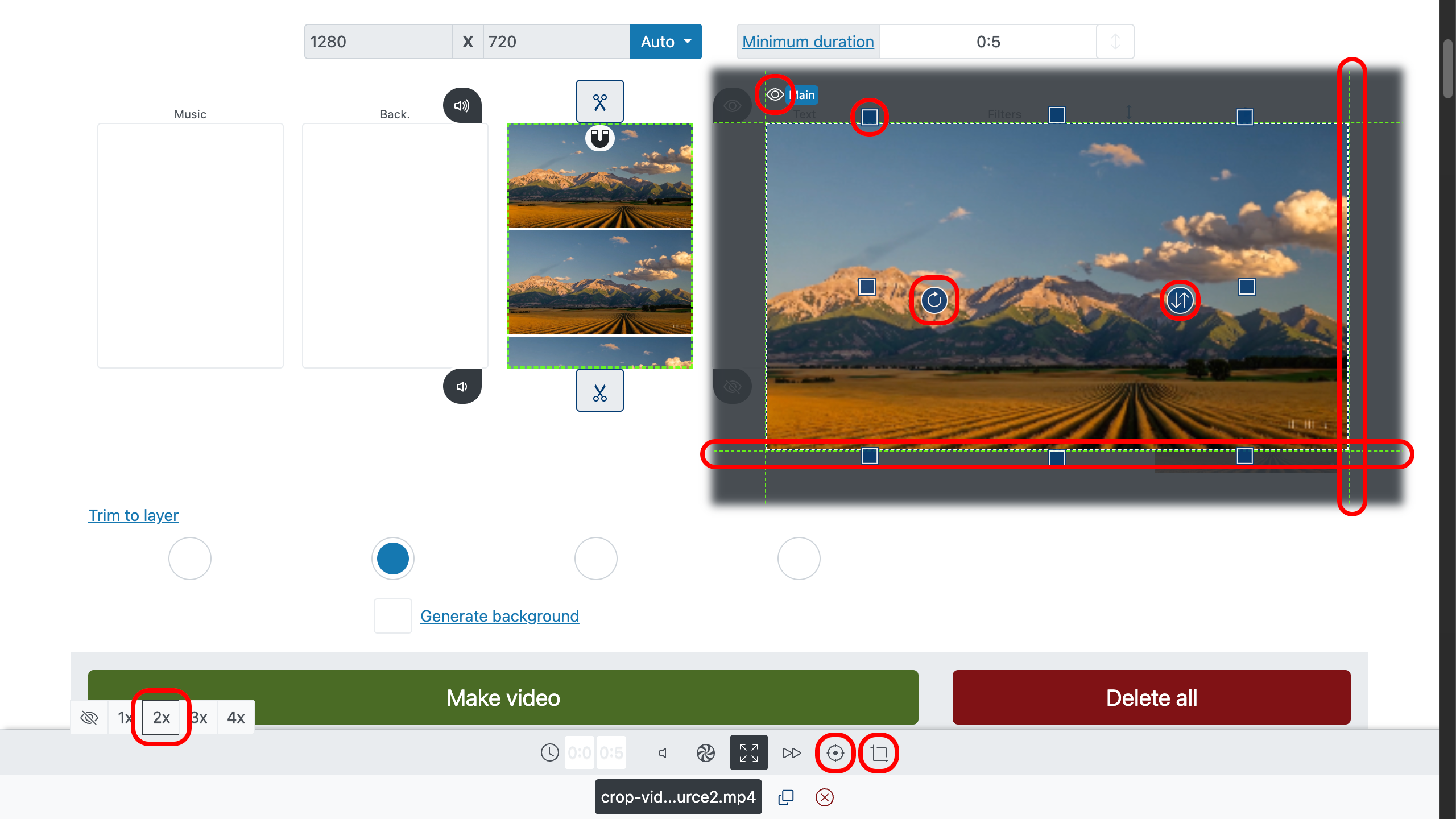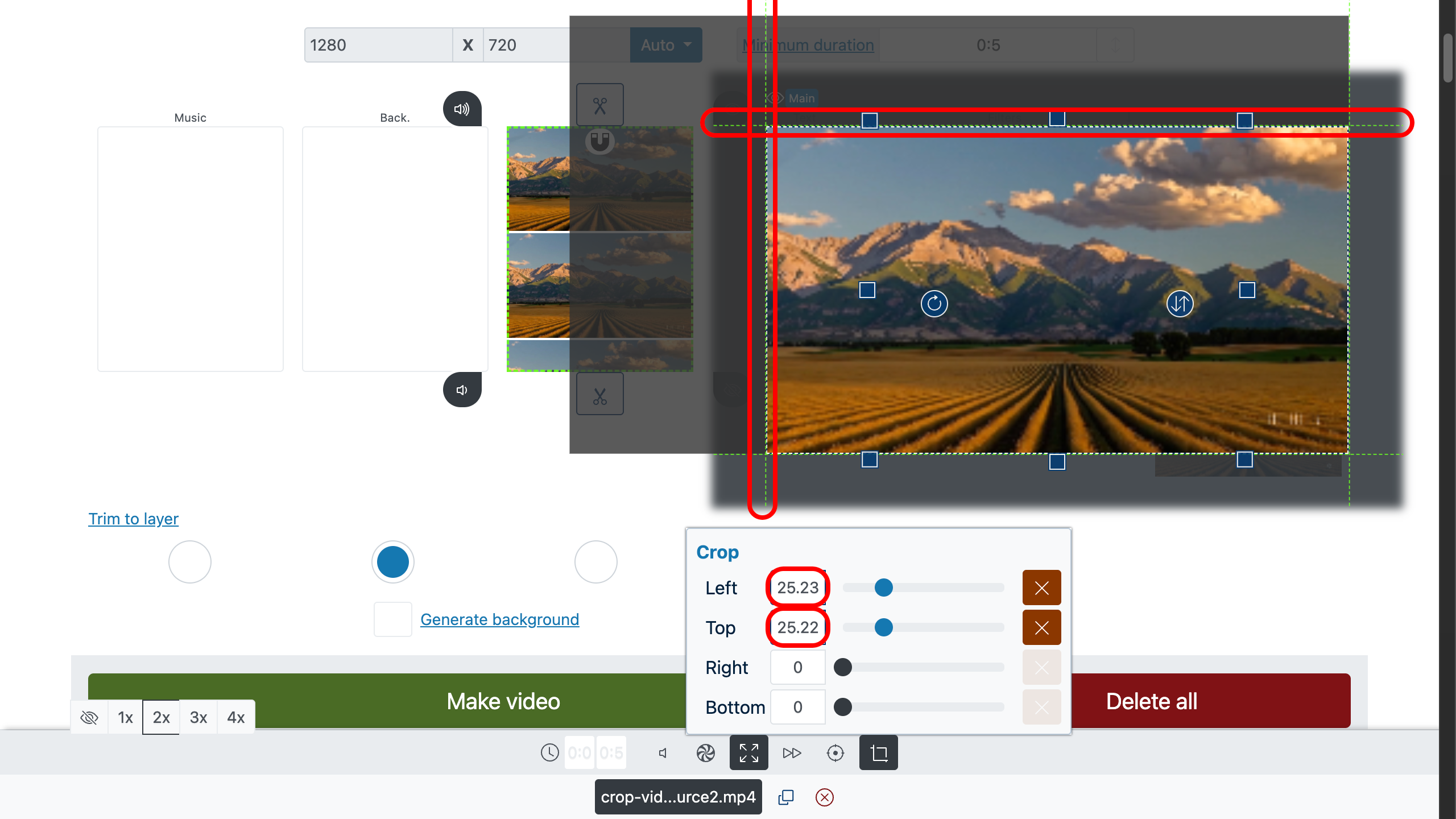 Nu til det sjove: brug de stiplede beskæringsgreb ved filens kanter for præcist at fjerne det, du ikke ønsker. Træk kanterne for at beskære yderområderne . Indholdet tilpasses automatisk det område, der er defineret med .
